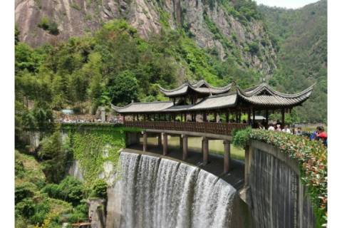 天台山大瀑布是天台山地标性景观, 也是浙东唐诗之路的标志性景观。 天台山大瀑布高 325 米, 最大宽度 90 米,堪称中华第一瀑, 主体九级瀑布水潭形态各异, 可供游人亲水嬉戏, 是我国罕见的亲水梯级瀑布群。 山顶游路由 2500 米的凌空栈道、 180 米的悬索桥、320 米的玻璃吊桥 和垂直达 205 米的电梯组成, 形成融峡谷景观、瀑布景观、 悬空栈道、时尚体验、 宗教文化于一体的大型山岳型景区。 天台山大瀑布为天台山国家级风景区之核心景观。 自古声名卓著,誉为天台山的两大地标之一。 晋孙绰《游天